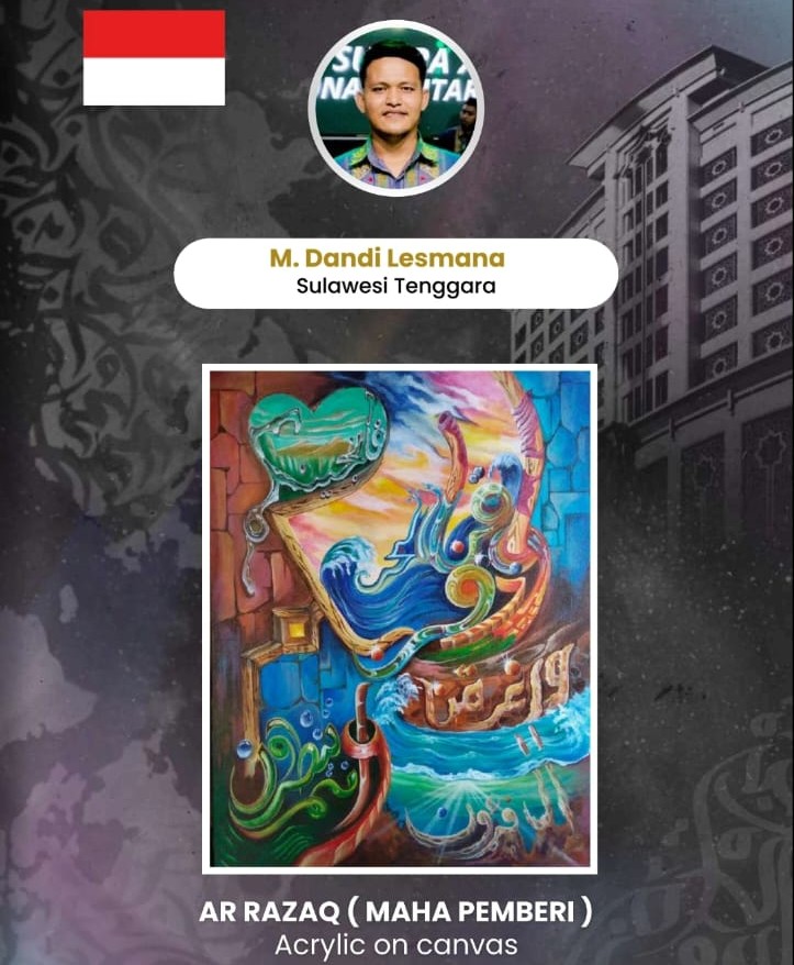 Karya Dandi menampilkan perpaduan antara unsur tradisi dan modernitas, memvisualisasikan makna nama Allah “Ar-Razzaq” melalui harmoni warna dan lekukan huruf Arab yang elegan. Keindahan dan pesan spiritual yang kuat dalam karyanya berhasil menarik perhatian banyak pengunjung.